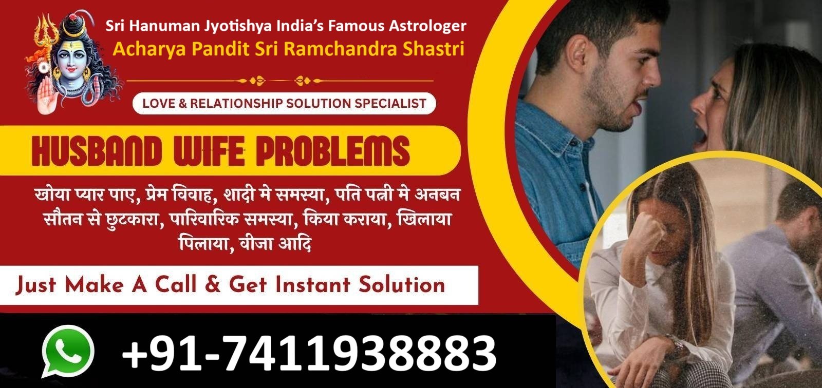 Whatever the problem, don't panic, contact us immediately and get the solution!! Convincing an angry lover and girlfriend, discord between husband and wife, finding lost love, family problems, convincing parents for marriage, getting rid of step-in-law etc. Solution to all problems just one phone call